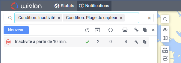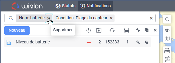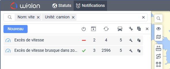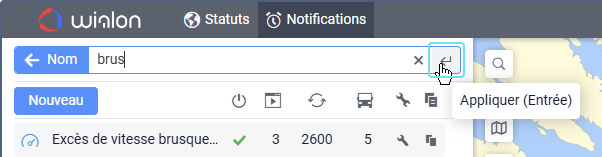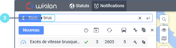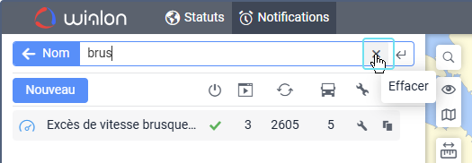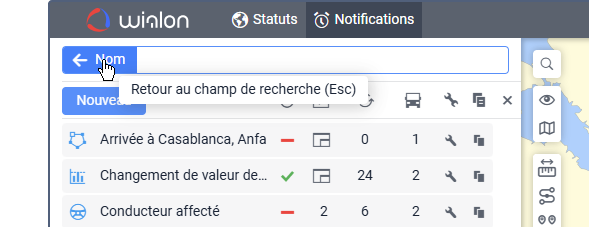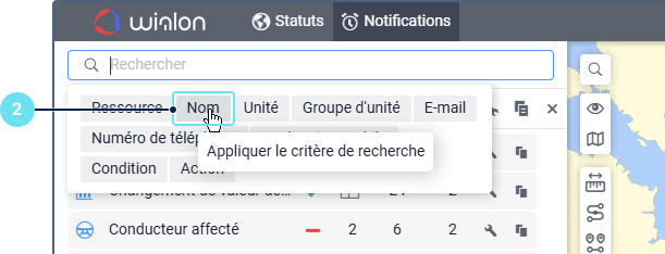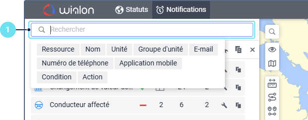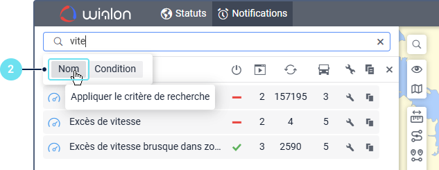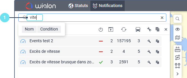 Sous le champ, vous pouvez voir tous les critères de recherche qui correspondent à votre requête. Par exemple, si vous saisissez « vitesse » et que vous avez des notifications nommées « Excès de vitesse », des notifications avec la condition Vitesse, et des notifications créées pour le groupe d’unités « Véhicules haute vitesse », vous verrez les critères Nom, Condition, et Groupe d’unités sous le champ de recherche.