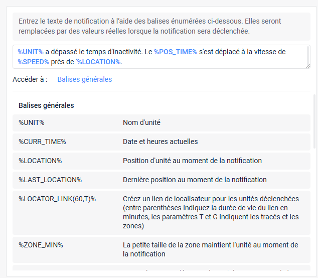| Localisation et zones | %LOCATION%, %LAST_LOCATION%, %LAT%, %LON%, %LATD%, %LOND%, %GOOGLE_LINK%, %LOCATOR_LINK%, %ZONES_ALL%, %ZONE_MIN% |