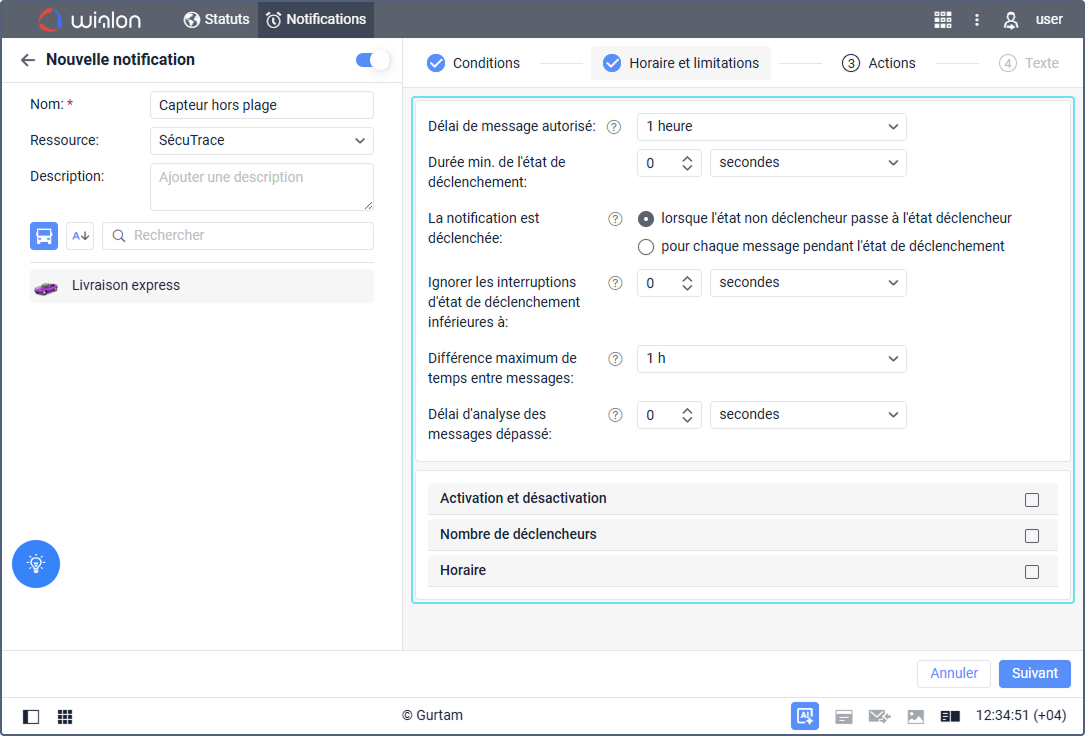 - Heure d’activation : Début de la période pendant laquelle les conditions de notification sont surveillées et la notification est déclenchée quand les conditions de déclenchement sont remplies.