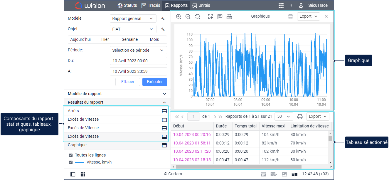 • Les rapports peuvent inclure les composants suivants : tableaux, graphiques, statistiques, une carte avec des tracés marqués dessus et des marqueurs d’arrêts, remplissage de carburant et d’autres actions avec l’unité.