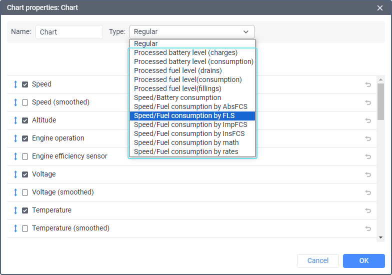 Contrairement aux graphiques spéciaux de niveau de carburant, les graphiques ordinaires n’affichent des données que dans le rapport litre/temps. Toutefois, vous pouvez sélectionner d’autres données, telles que la tension, afin qu’elles soient affichées sur le graphique avec le niveau de carburant.