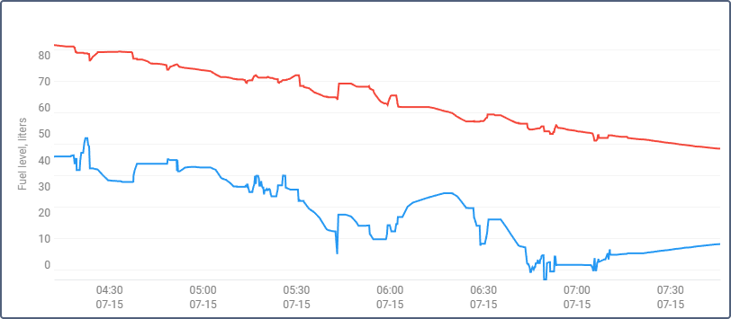 Le graphique montre la dépendance du niveau de carburant par rapport au kilométrage (litres/kilométrage). Il peut également montrer la dépendance du niveau de carburant par rapport au temps (litres/temps) si l’option Calculer la consommation de carburant en fonction du temps est activée dans les paramètres du capteur. Dans les deux cas, le graphique est traité en tenant compte du filtrage qui est également défini dans les paramètres du capteur.