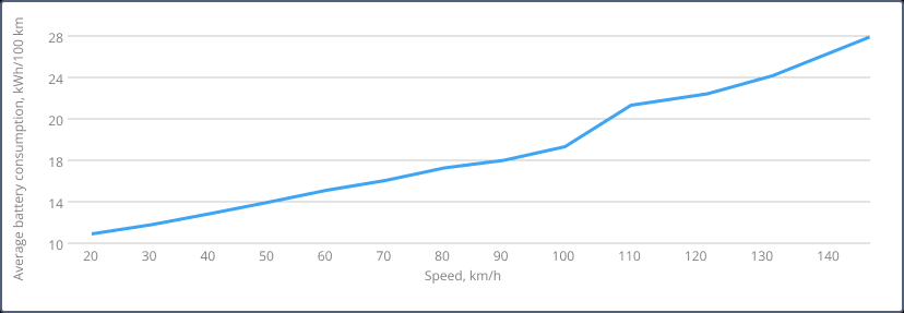 Le graphique montre la dépendance de la consommation de la batterie par rapport à la vitesse. Les données du graphique proviennent des relevés du capteur de niveau de batterie.