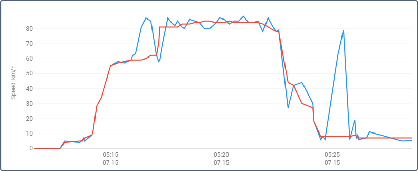 L’image ci-dessous montre le diagramme de vitesse combiné au diagramme de niveau de carburant. Pour recevoir un tel graphique, il est nécessaire de définir le type de graphique comme Régulier et de sélectionner les données Vitesse, Vitesse (lissée) et Niveau de carburant.
