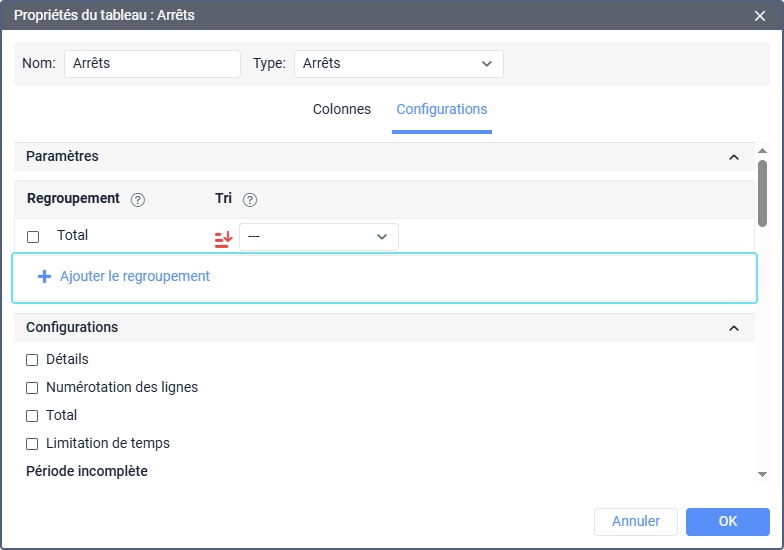 Parmi les intervalles de temps disponibles (année, saison, mois, semaine, jour du mois, jour, date, équipe, durée), sélectionnez ceux sur la base desquels vous souhaitez regrouper les données de tableaux. Le regroupement peut être à un ou plusieurs niveaux. Le regroupement à plusieurs niveaux implique qu’il existe plusieurs regroupements pour différents intervalles de temps. Lorsqu’on l’utilise, il est nécessaire d’attribuer une hiérarchie (spécifier l’imbrication). Par exemple, le regroupement peut être le suivant : les données de tableaux sont regroupées par année, à l’intérieur de chaque année par mois et à l’intérieur des mois par jours. L’imbrication est ajustée en faisant glisser les intervalles de la colonne Regroupement vers le haut ou vers le bas, les éléments situés au-dessus de la liste contenant ceux qui sont situés en dessous.