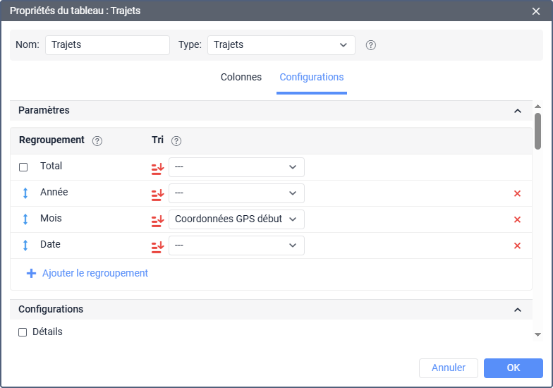 Dans la section Paramètres, vous pouvez configurer le regroupement et le tri des données du rapport.