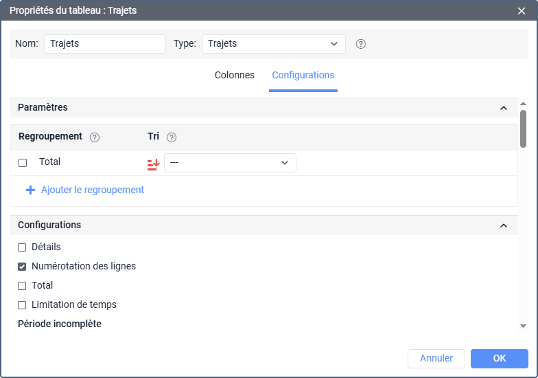 Lors du regroupement des données du tableau, il est judicieux d’utiliser la colonne Durée totale qui, contrairement à la colonne Durée, indique non pas la somme des intervalles (par exemple, la durée totale de tous les déplacements), mais le temps écoulé entre le début du premier intervalle et la fin du dernier. Cela permet, par exemple, de calculer la durée totale d’une journée de travail (pratique pour les feuilles de route).