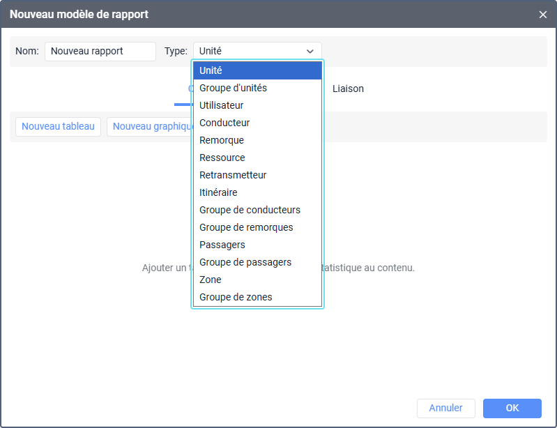 Le type de tableau est sélectionné dans la liste déroulante située à droite de son nom. Le nombre de types disponibles dépend du modèle de rapport sélectionné.