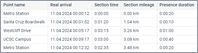 Le tableau Étapes affiche des informations sur les étapes définies lors de la création de l’itinéraire et sur les visites effectuées aux points de contrôle.