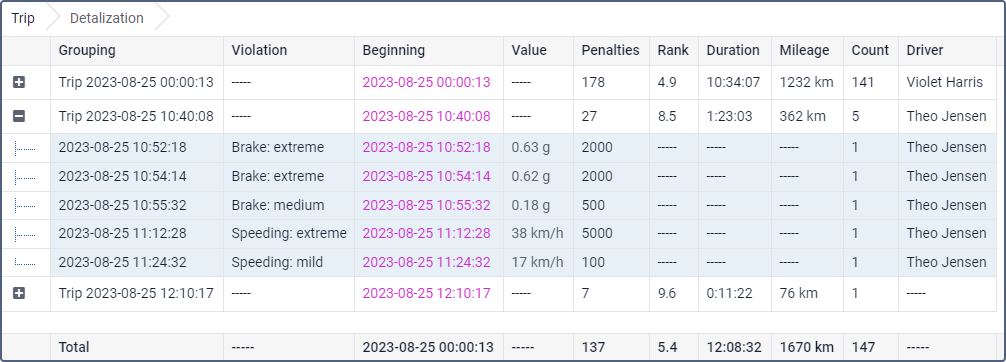 En outre, outre le regroupement, une option de détails peut être appliquée. Cette option permet de visualiser le dernier niveau d’imbrication (date et heure) à l’intérieur du regroupement. Toutefois, il faut tenir compte du fait qu’une pénalité et un classement peuvent être attribués pour une infraction qui s’est produite à un certain moment (et non immédiatement). C’est pourquoi, au dernier niveau d’imbrication (date et heure), un tiret apparaît dans la colonne Evaluation et la colonne Pénalité reçoit la valeur indiquée dans l’onglet Éco-conduite des propriétés de l’unité.