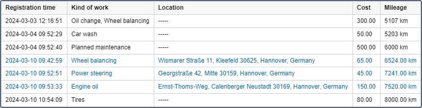 Le tableau Maintenance contient la liste des travaux de maintenance effectués au cours de la période indiquée et enregistrés par l’utilisateur pour l’unité sélectionnée.