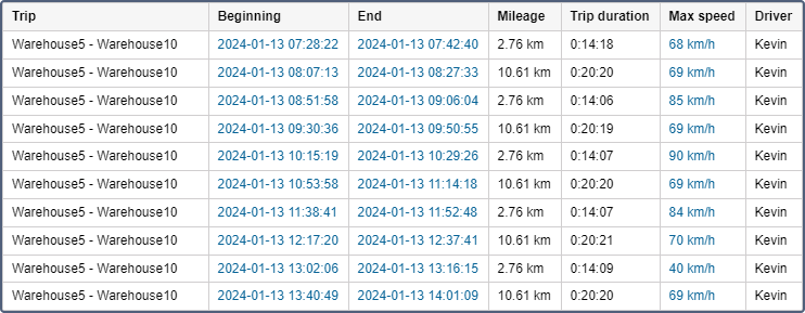 | Temps total | Il est recommandé d’utiliser cette colonne en combinaison avec le paramètre de regroupement ou la ligne Total. Si la ligne Total est configurée dans le tableau, elle indique tout le temps écoulé depuis le début du premier déplacement jusqu’à la fin du dernier. |