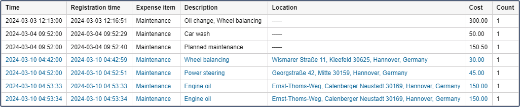 Seuls les remplissages de carburant enregistrés manuellement dans un registre spécial des événements y figurent (les remplissages détectés par un capteur de carburant ne sont pas pris en compte).
