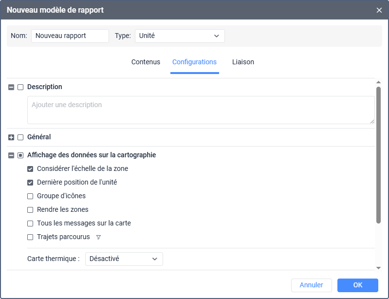 Les tracés d’unités et les zones peuvent être dessinées sur la carte dans le cadre du rapport. Ils peuvent être sélectionnés dans la section Affichage des données sur la cartographie de l’onglet Configurations de la boîte de dialogue du modèle de rapport.