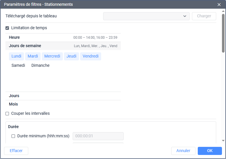 Si le filtrage des intervalles a déjà été défini pour un tableau du type correspondant et que ce filtrage doit également être défini pour l’affichage des éléments graphiques sur la carte, vous pouvez faciliter le processus d’indication des paramètres de filtrage en téléchargeant ceux qui sont appliqués au tableau. Pour ce faire, sélectionnez un tableau correspondant dans la liste déroulante (première ligne de la boîte de dialogue) et cliquez sur Télécharger.