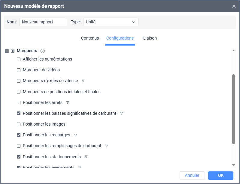 ) pour les marqueurs de remplissage, de baisse, de recharge de batterie, d’arrêt, de stationnement, d’excès de vitesse et d’événement. Les paramètres de filtrage configurés dans cette section sont appliqués aux marqueurs sur la carte et dans les graphiques.