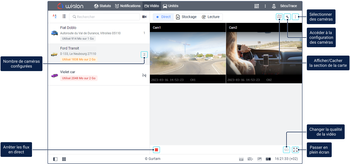 Sur cet onglet, vous pouvez regarder les flux en direct des caméras de l’unité et suivre le mouvement de l’unité sur la carte.