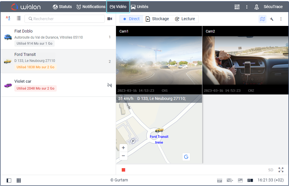 | Flux vidéo | Regarder les flux en direct des caméras de l’unité et suivre le mouvement de l’unité sur la carte. |