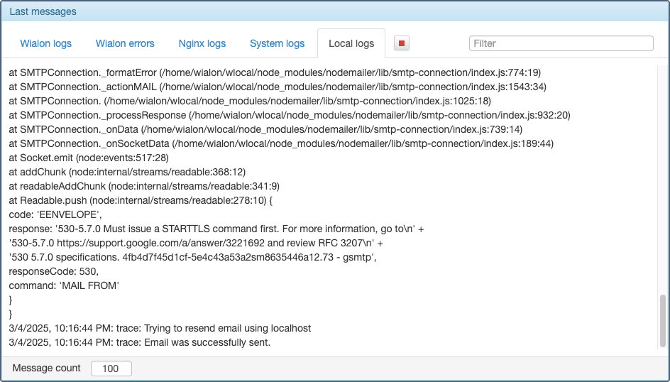 /var/log/mail.log*). - Journaux Wialon Local sans le travail des utilisateurs, c’est-à-dire les processus automatiques seulement (