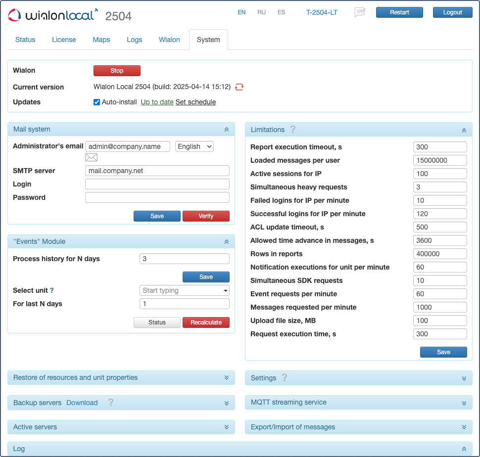 Sur cette page, vous pouvez démarrer/arrêter Wialon Local manuellement, installer les mises à jour, ajuster le serveur de messagerie et définir des limitations importantes.