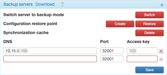 | DNS, Port, Clé d’accès | Dans ces champs, vous devez spécifier le DNS, le port et la clé d’accès pour chaque serveur de sauvegarde, respectivement. Ces paramètres sont vérifiés par rapport à ceux spécifiés dans le fichier config.txt du serveur de sauvegarde. |