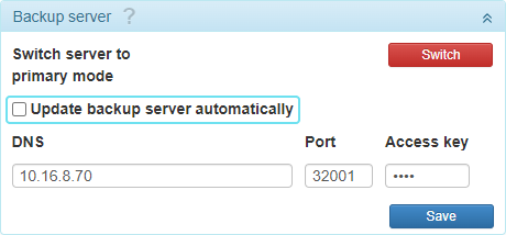 | Mettre à jour le serveur de sauvegarde automatiquement | L’option est disponible si le système d’administration fonctionne en mode serveur de sauvegarde (voir l’image ci-dessous) et que le serveur de sauvegarde a été installé dans le répertoire /home/wialon/wl_storage_backup conformément à la méthode 1.Si l’option est activée, lors de l’installation d’une mise à jour qui contient un module de sauvegarde, non seulement le dossier /home/wialon/wlocal/modules/backup est mis à jour, mais aussi la partie logicielle du serveur de sauvegarde installée dans le répertoire /home/wialon/wl_storage_backup.Les composants suivants sont mis à jour dans le répertoire /home/wialon/wl_storage_backup :- dossiers bin, dep, lib, plugins et scripts ;- fichiers adf_script, adf_service.txt et environment.txt.Les dossiers storage (base de données du serveur de sauvegarde), custom (paramètres du serveur de sauvegarde), tmp et logs ne sont pas mis à jour.Si l’option est activée, lors de l’installation d’une mise à jour qui contient un module de sauvegarde, le serveur de sauvegarde redémarre automatiquement. |