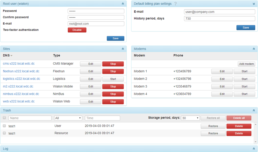 Cette page n’est accessible que lorsque Wialon Local fonctionne. Ici vous configurez les sites et modems, gérez la corbeille, etc.