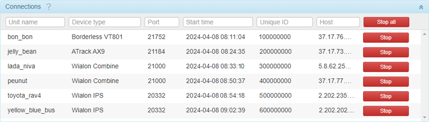 Dans cette section, vous pouvez voir un tableau de toutes les unités qui ont une connexion en ce moment.