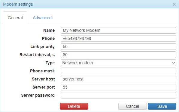 | Port série | Pour le modem GSM, vous pouvez spécifier le port physique du serveur auquel il est connecté. |