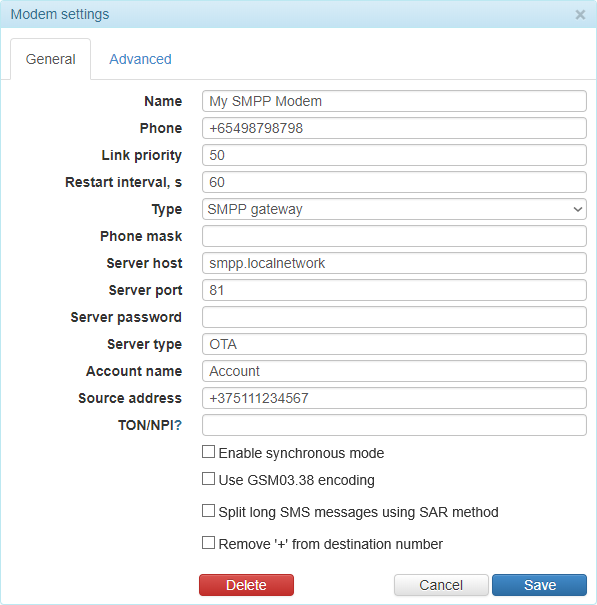 Paramètres de la passerelle SMPP
