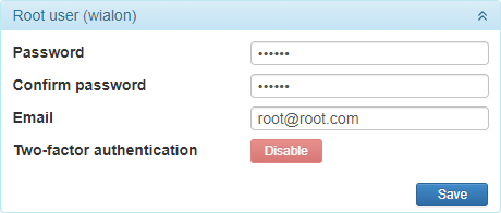 Sur la page Wialon, vous pouvez saisir l’adresse email et le mot de passe pour l’utilisateur root. L’email est requis lorsque vous voulez réinitialiser le mot de passe, le mot de passe est nécessaire lorsque vous voulez vous connecter. Si nécessaire, ici vous pouvez également désactiver l’authentification à deux facteurs pour l’utilisateur root.