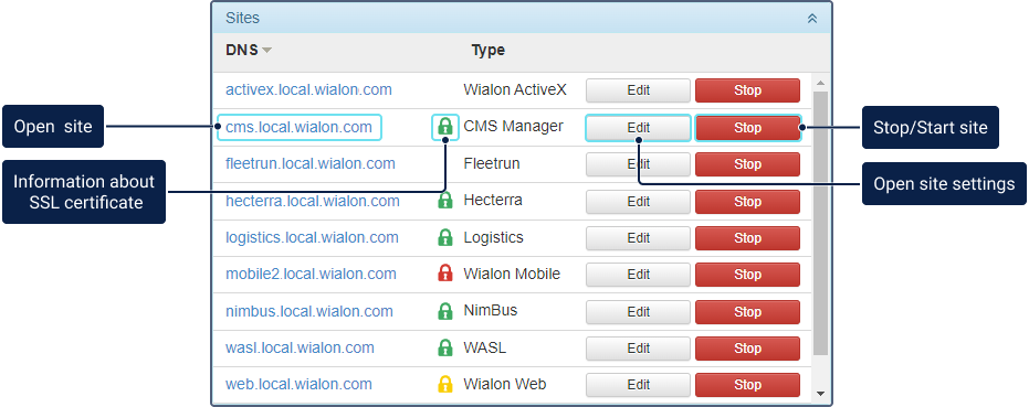 La section Sites est un tableau où le DNS et le type de chaque site sont spécifiés. Pour ouvrir le site requis, cliquez sur son lien DNS.