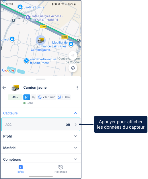 Capteurs Les capteurs pour lesquels l’option Visible est activée dans l’onglet Capteurs de la version Web de Wialon. L’ordre des capteurs dépend de leur ordre de configuration dans l’onglet. Appuyez sur une ligne de capteur pour afficher un graphique avec les valeurs historiques du capteur. Consultez la section Affichage des données de capteur pour plus de détails.