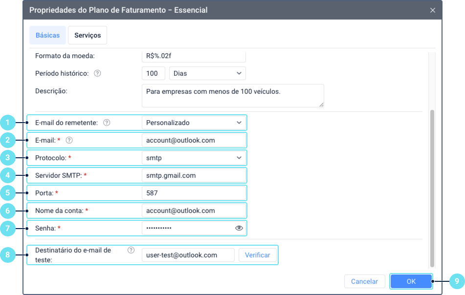 Na aba Básicas é possível especificar as configurações básicas do plano de faturamento relacionadas ao bloqueio de contas, armazenamento de dados e assim por diante. Algumas dessas configurações podem ser especificadas manualmente para cada conta separada. Além disso, aqui você pode configurar os parâmetros de e-mail para o envio de diversas mensagens do sistema (alertas, relatórios, etc.).