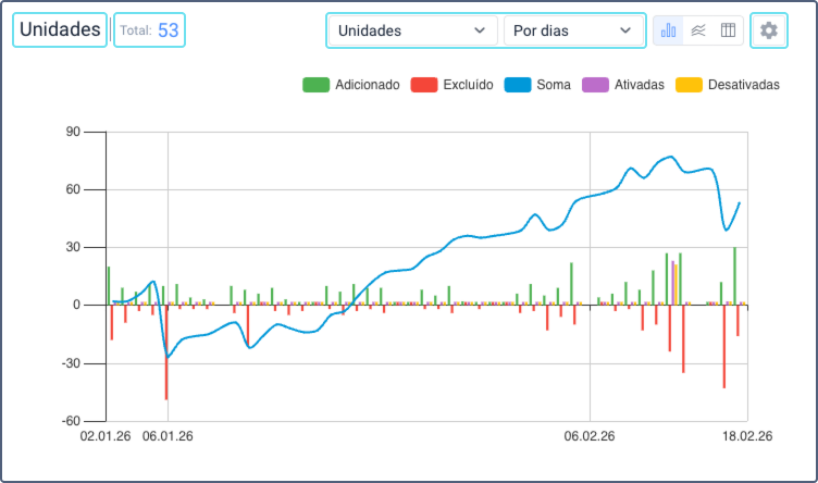 Cada gráfico detalha os objetos adicionados e excluídos. Se a opção Unidades for selecionada, também será exibido o número de unidades ativadas e desativadas. Além disso, os gráficos de barras e linhas mostram a diferença entre o número de objetos adicionados e excluídos desde o início do período até o ponto selecionado (Geral).