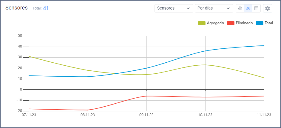 O nome do gráfico é exibido no cabeçalho, à esquerda, junto com o indicador Total. À direita, encontram-se listas suspensas e botões que, dependendo do tipo de gráfico, permitem alterar o formato de visualização, o tipo de objeto ou o agrupamento dos dados. Também é aqui que fica o botão para abrir a janela de configurações.