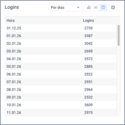 Este bloco contém informações sobre os acessos ao sistema (logins). O indicador Total exibe a quantidade total de acessos e o tempo médio das sessões.