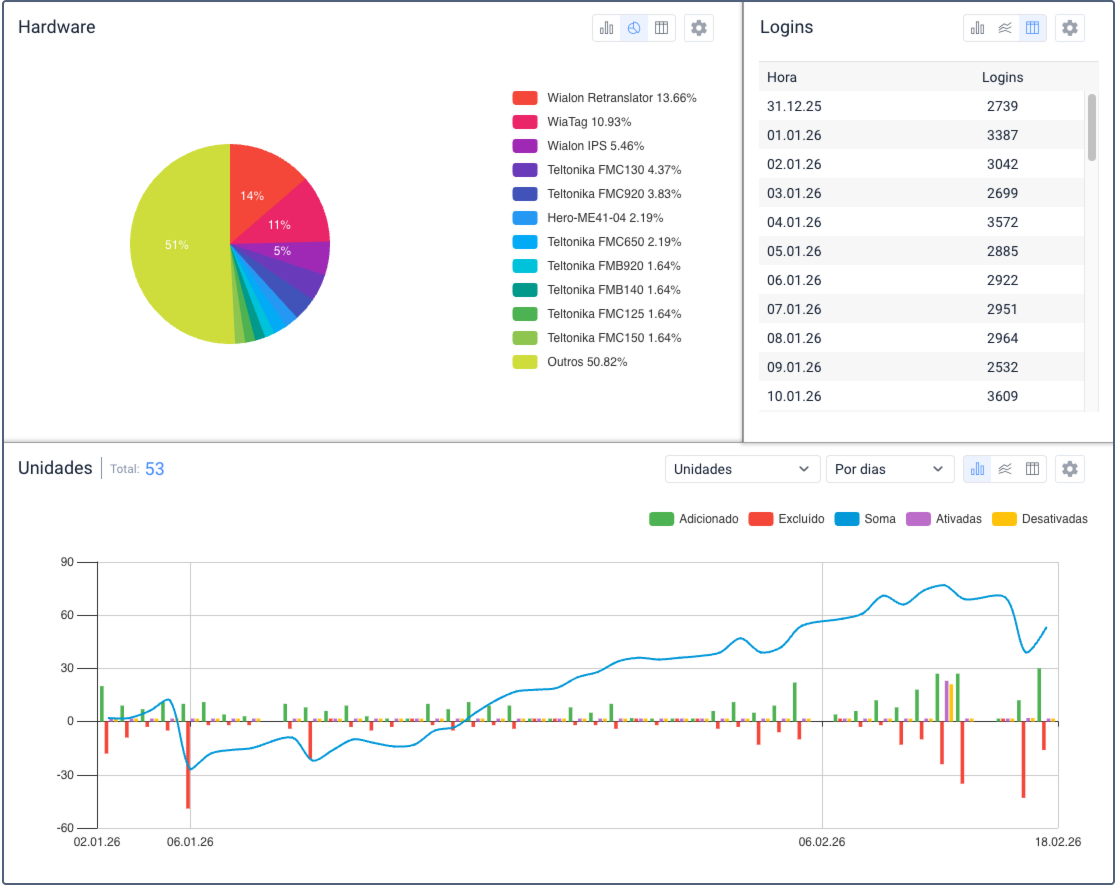 Este bloco contém informações sobre as unidades adicionadas ou excluídas de acordo com o tipo de hardware (rastreador). Os dados podem ser apresentados em gráfico de barras, pizza ou tabela.