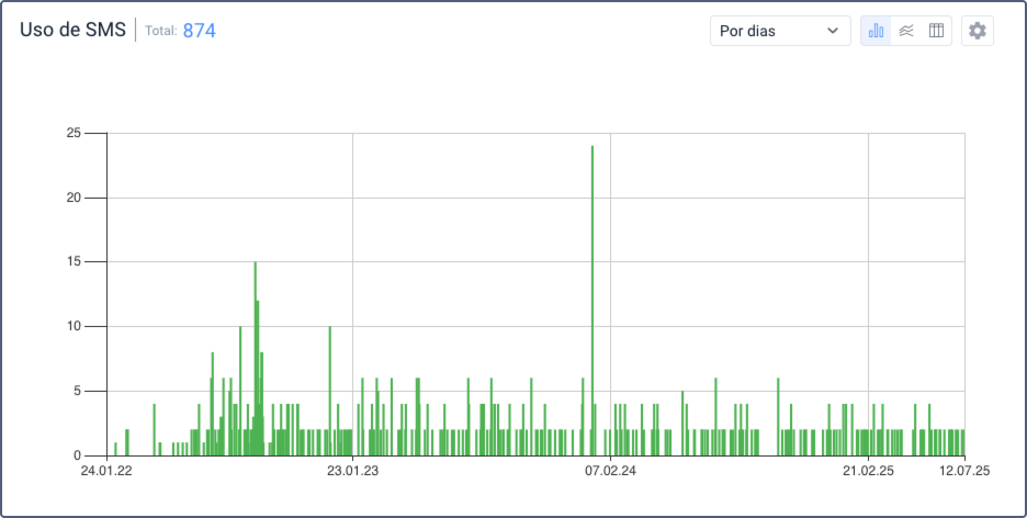 Dados sobre o consumo total de SMS, que podem ser exibidos como gráfico de barras, linhas ou tabela, com agrupamento por dia, semana, mês ou trimestre.