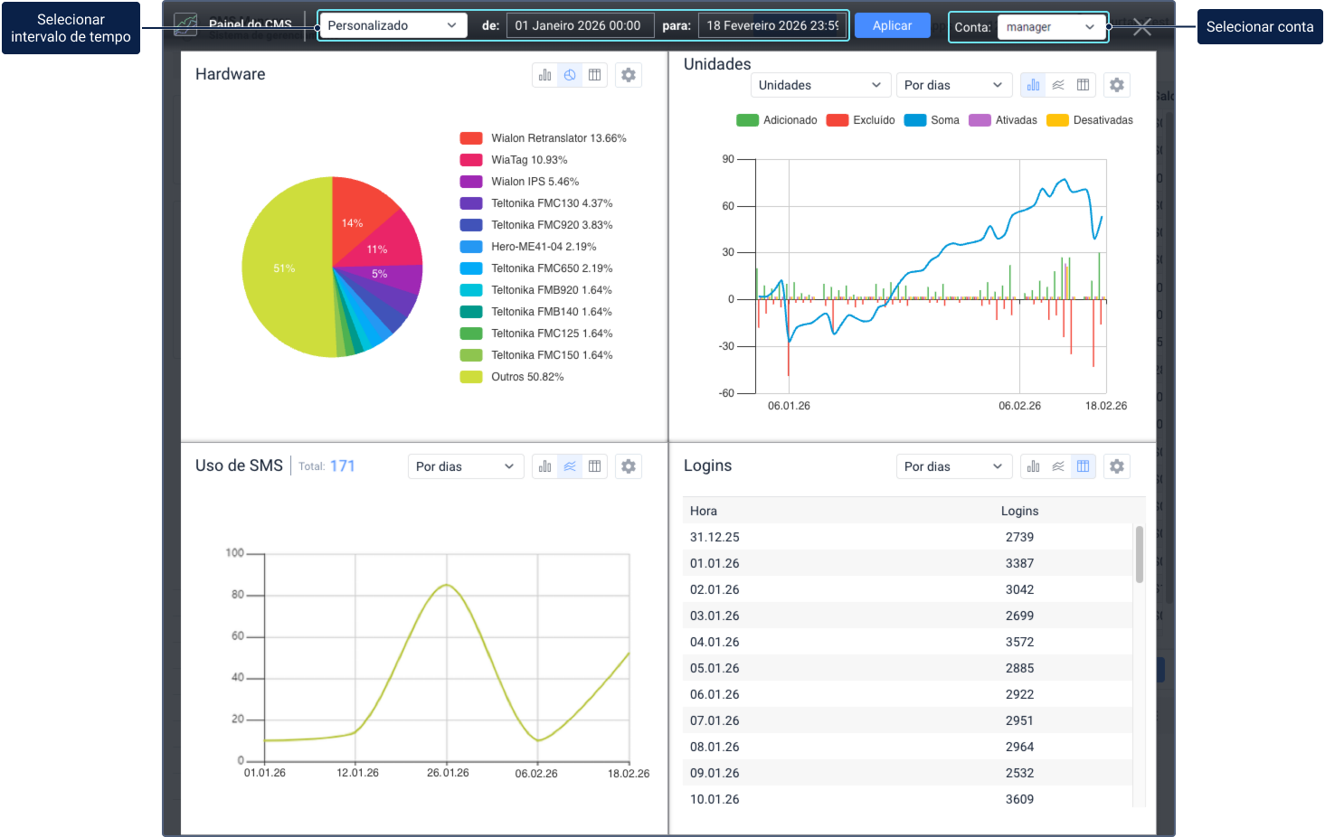 Na página Dashboard, estão disponíveis gráficos para 4 tipos de dados: objetos do sistema, hardware, uso de SMS e acessos.
