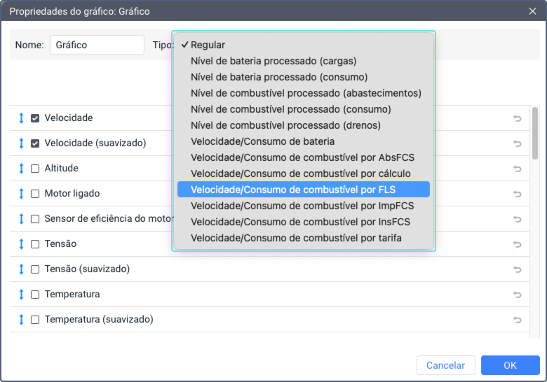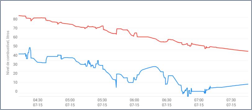 Diferentemente dos gráficos especiais de nível de combustível, os gráficos regulares mostram dados apenas na proporção litro-tempo. No entanto, você pode selecionar outros dados, como tensão, para que sejam exibidos no gráfico com o nível de combustível.