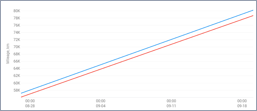 Quatro tipos de gráficos de quilometragem podem ser criados: quilometragem absoluta, quilometragem em viagens, quilometragem instantânea e quilometragem instantânea suavizada. Os dois primeiros mostram como a quilometragem mudou (aumentou) ao longo do tempo. O gráfico Quilometragem absoluta é construído com base em todas as mensagens, o que significa que qualquer imprecisão e dados discrepantes afetam o gráfico resultante. O gráfico Quilometragem em viagens exibe os dados levando em conta as configurações do detector de viagens.