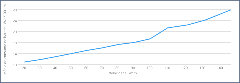 O gráfico mostra a dependência do consumo da bateria em relação à velocidade. Os dados do gráfico são obtidos das leituras do sensor de nível da bateria.