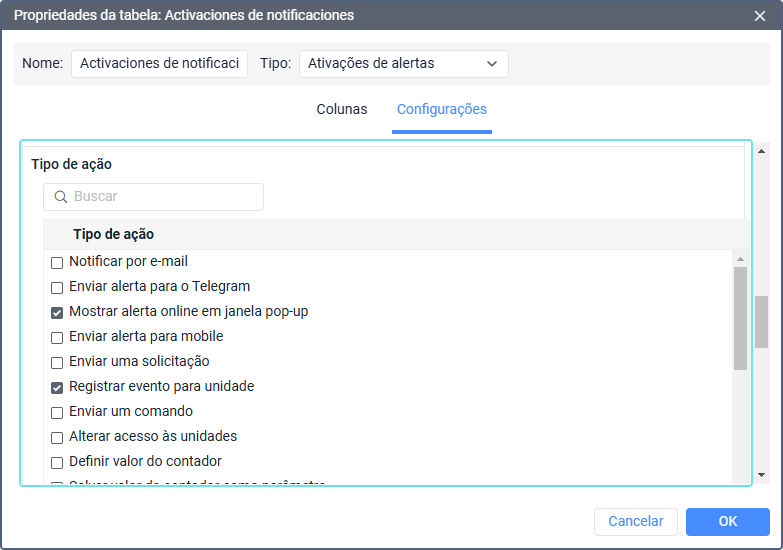Se quiser incluir as notificações acionadas apenas com determinadas ações na tabela, marque as ações na lista. Para encontrar a ação de alerta necessária, use o campo de pesquisa acima da lista.