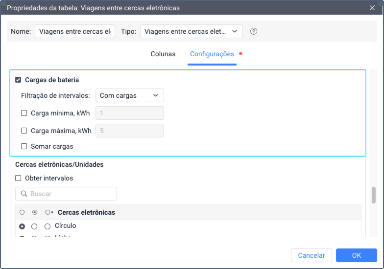 O filtro Cargas de bateria permite incluir no relatório os intervalos em que cargas foram detectadas, ou intervalos sem cargas. Nos campos Carga mínima e Carga máxima, é possível especificar o volume mínimo e/ou máximo de carga necessário para incluir o intervalo no relatório.
