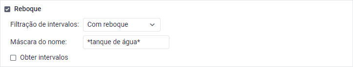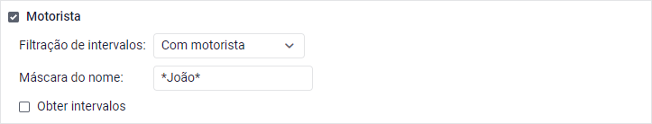 | Com motorista | O relatório mostra os intervalos em que os motoristas foram vinculados às unidades. No campo Máscara de nome deve-se especificar a máscara de nome do motorista cujos intervalos devem ser incluídos no relatório. A máscara também funciona se vários motoristas forem atribuídos à unidade simultaneamente dentro de um determinado intervalo. Para ver vários motoristas no relatório, ative a opção Vários motoristas/reboques nas configurações do modelo. Exemplo. Um relatório sobre viagens é executado. Durante uma das viagens, dois motoristas foram vinculados à unidade: João e Davi. Se João for especificado no campo Máscara de nome, o relatório mostrará apenas as viagens em que o João foi o único condutor vinculado. Se *João* (com asteríscos) for especificado no mesmo campo, o relatório incluirá também a viagem em que João e Davi foram atribuídos como condutores. Os intervalos são mostrados na íntegra, independentemente de o condutor ter sido vinculado no início, no meio ou no final de tal intervalo. Caso o usuário deseje visualizar a parte exata do intervalo em que o condutor foi vinculado à unidade, será necessário habilitar a opção Obter intervalos. |