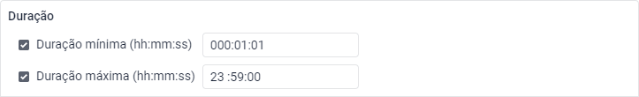 Este filtro consiste nos campos Duração mínima e Duração máxima onde é possível especificar a duração mínima e máxima dos intervalos a serem mostrados no relatório. O valor máximo permitido para este filtro é 999h 59min 59s (cerca de 41 dias e 16 horas).