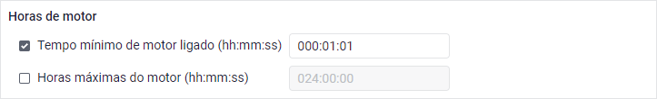 Neste filtro é possível especificar a duração mínima e/ou máxima das horas de motor necessárias para o intervalo que deve ser incluído no relatório. O valor máximo permitido para este filtro é 99h 59min 59s (cerca de 4 dias e 4 horas).
