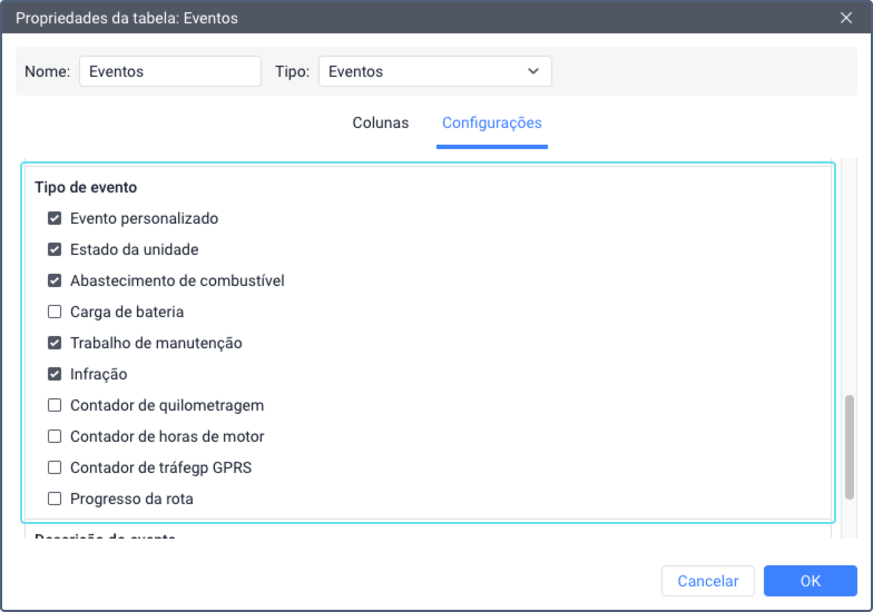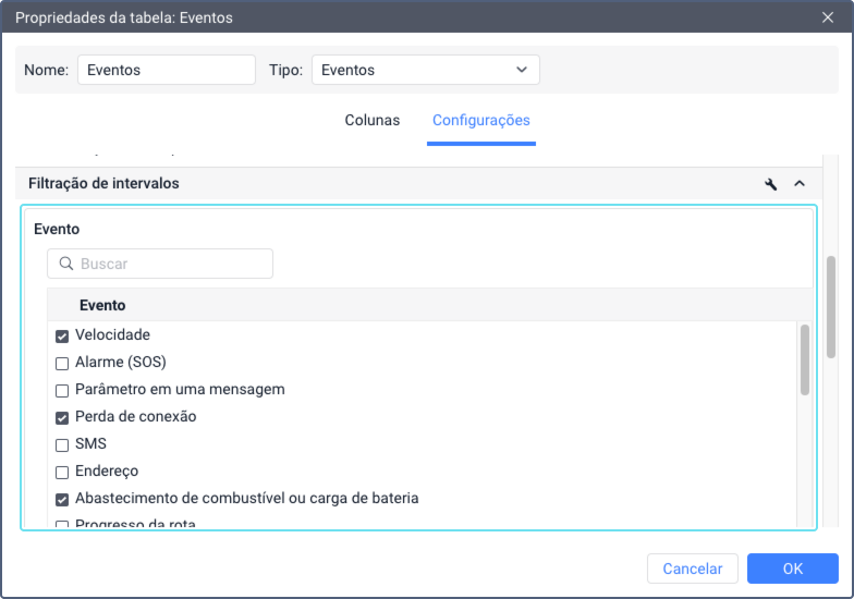 Se você deseja incluir apenas certos tipos de eventos na tabela, marque-os na lista.