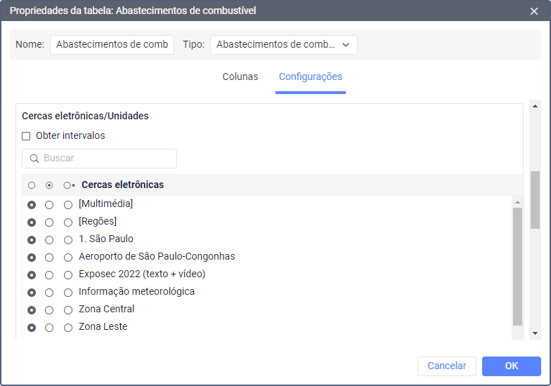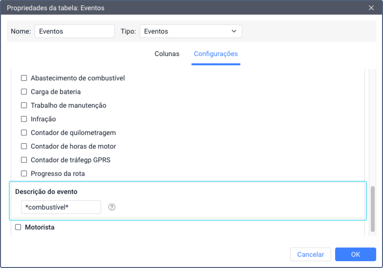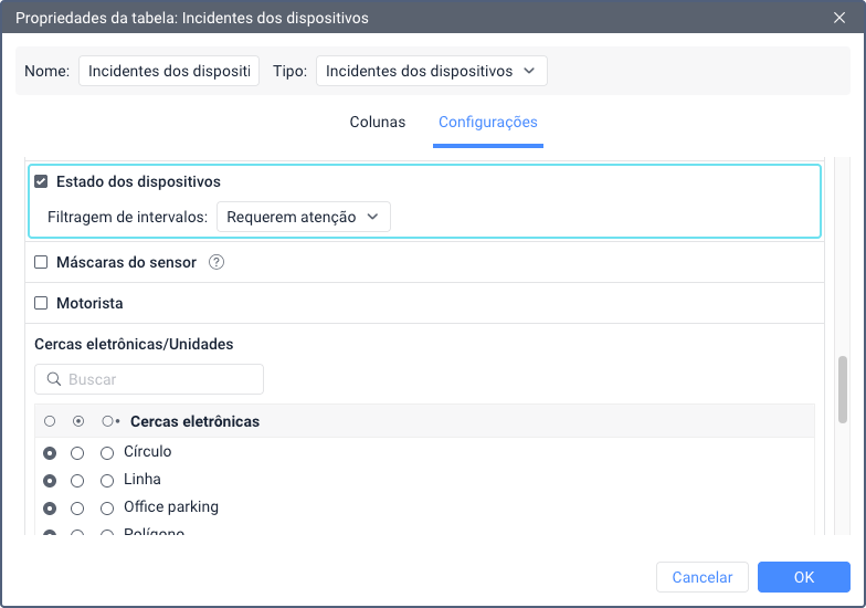 Este filtro é usado apenas nas propriedades das tabelas Sensores contadores e Movimento de combustível. Na última, você pode encontrá-lo no filtro Sensores.